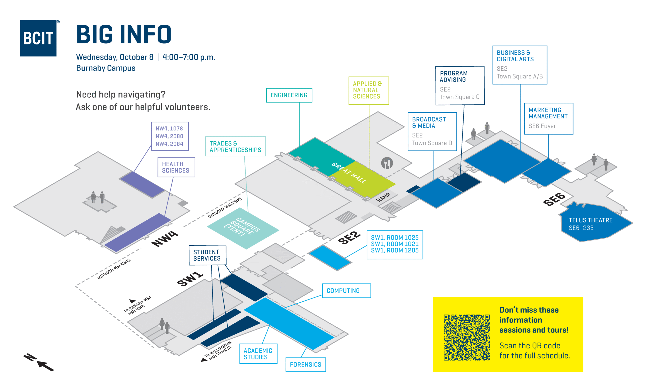 Big Info is the largest program expo and information session at BCIT. It’s your chance to find out about all our programs – from business and media, computing and IT, engineering, health sciences, trades and apprenticeships, and applied and natural sciences. It’s free. It’s lively. It’s a night of possibilities. Join us in person on Wednesday, October 8 from 4:00pm – 7:00pm at our Burnaby campus.