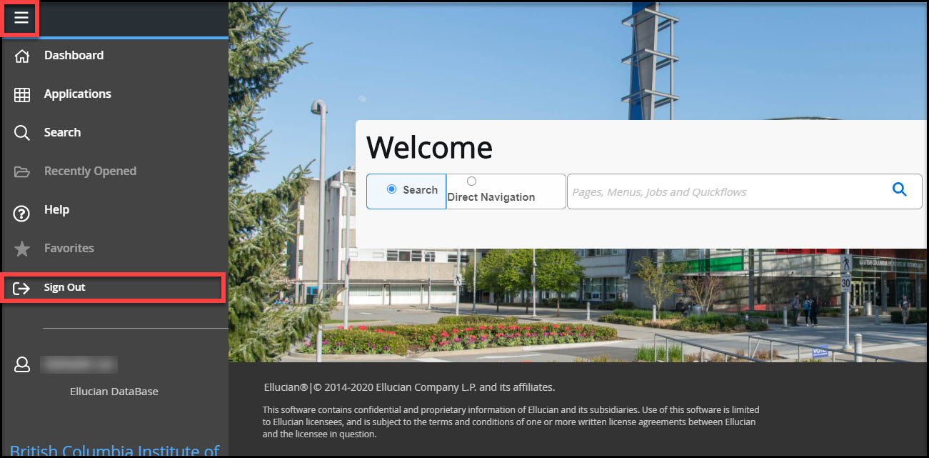 1. Click on the Sign Out icon or press Ctrl-Shift-F to log out of the application. TIP:Always end your work session by using the Sign Out icon. Clicking Close (x) instead of signing out might leave your connection to the application open, without properly closing or saving the data.