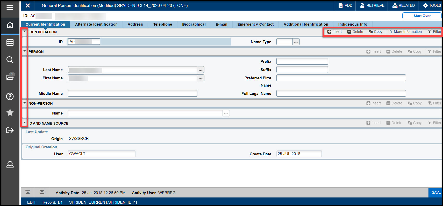 When the cursor is in a section the action buttons become enabled for that section. (notice the action buttons in the first block are darker than other sections, indicating they are active). Action buttons include:
