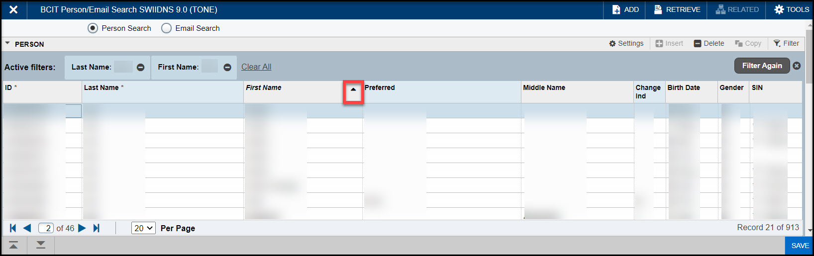 8. Once all filter criteria are entered, click Go (F8) to display the results. The number of records received is displayed at the bottom of the section. The results for a field can be sorted in ascending or descending order by clicking on the field label in the column header. You can reverse the sort order by clicking the field label.