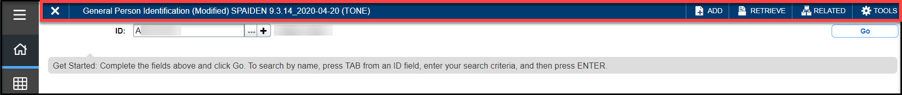 Applications (CTRL+M) – Click the Applications icon to open the Banner menus. Select a button and continue selecting until you find the page you are interested in opening. Select the descriptive name or acronym to open the page.