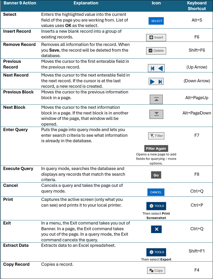 The following are common icons and keyboard shortcuts used in Banner 9.