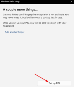 - Follow the prompts to scan your finger print. Once your fingerprint has been scanned, you will be notified that you must set up a PIN. Click on Set up PIN to begin this process.