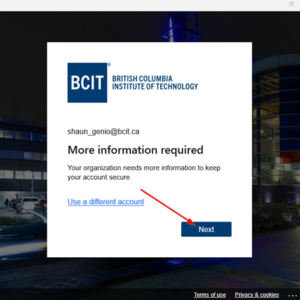 - You will be redirected to a BCIT login menu to begin MFA setup for your BCIT issued Microsoft Account. Click Next.