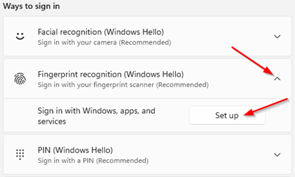 - Expand the Fingerprint recognition (Windows Hello) menu and click on the Set up button.