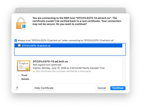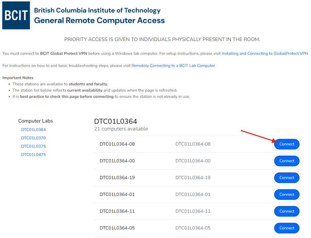 Please note that priority access is given to individuals physically present in the lab. If you are connecting remotely, please ensure that you are saving your work frequently to avoid data loss. For more information on saving your work, please refer to the Accessing Your Stored Files in OneDrive, ShareIn/ShareOut and BCIT Network Drives knowledge base article.