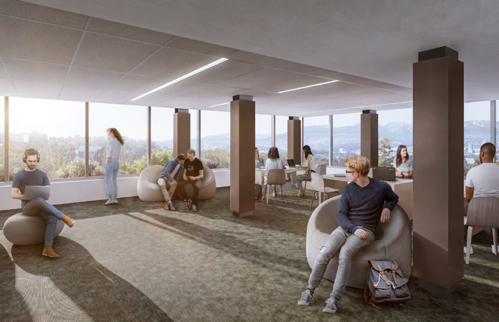 “And of course, inside the building that means that there are some really wonderful common spaces for students. In the lounges, every floor provides a different experience – on the lower levels there are mature trees right outside the windows and it kind of feels like you’re in the woods. And then as you move up the building, it becomes all about the view over the campus and the city.”