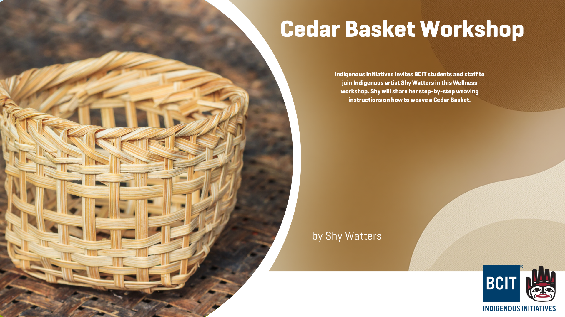 SW1 - 1521 (BCIT Indigenous Gathering Place)Join Indigenous artist Shy Watters in this Wellness workshop. Shy will share her step-by-step weaving instructions for a Cedar Basket making.