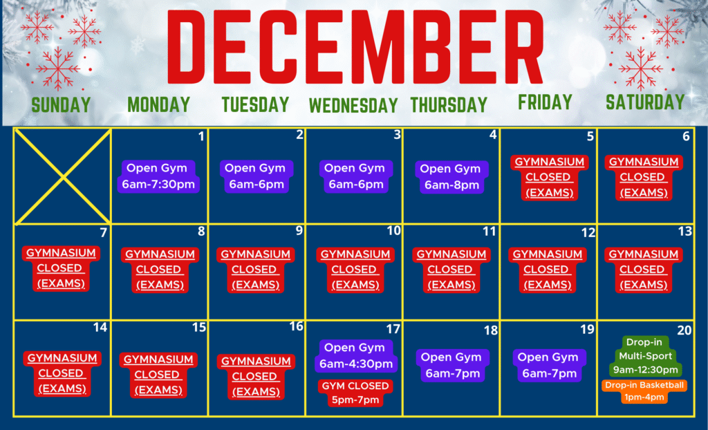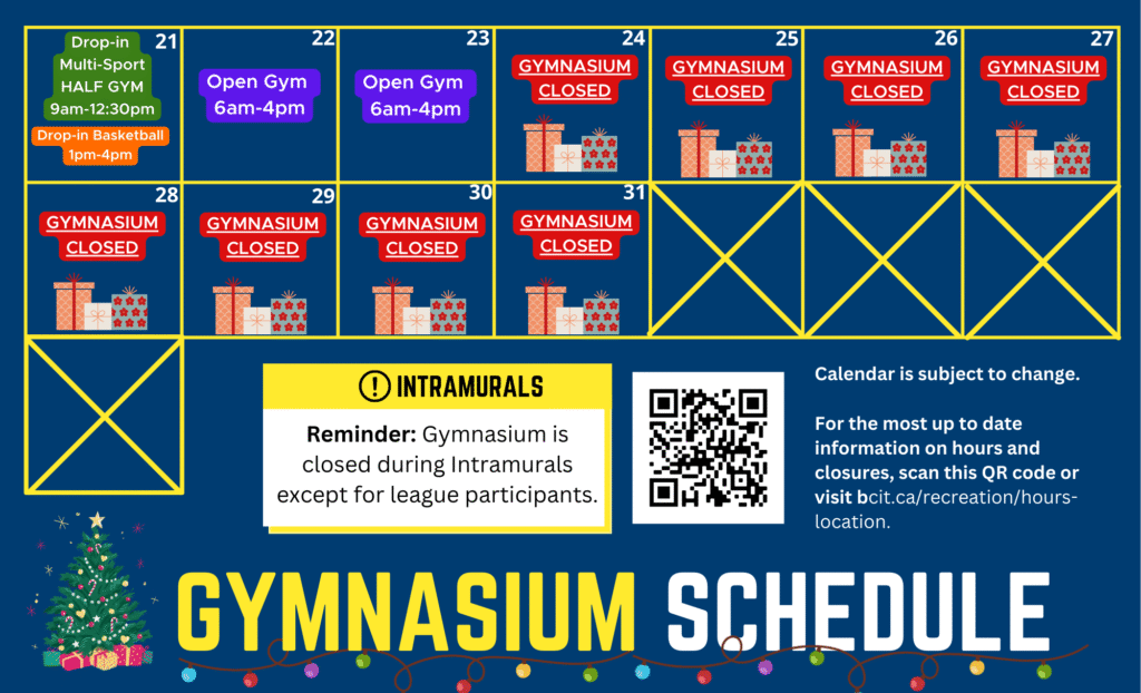 The Recreation building at SE16 on the Burnaby Campus will be closed on the following dates in 2025: