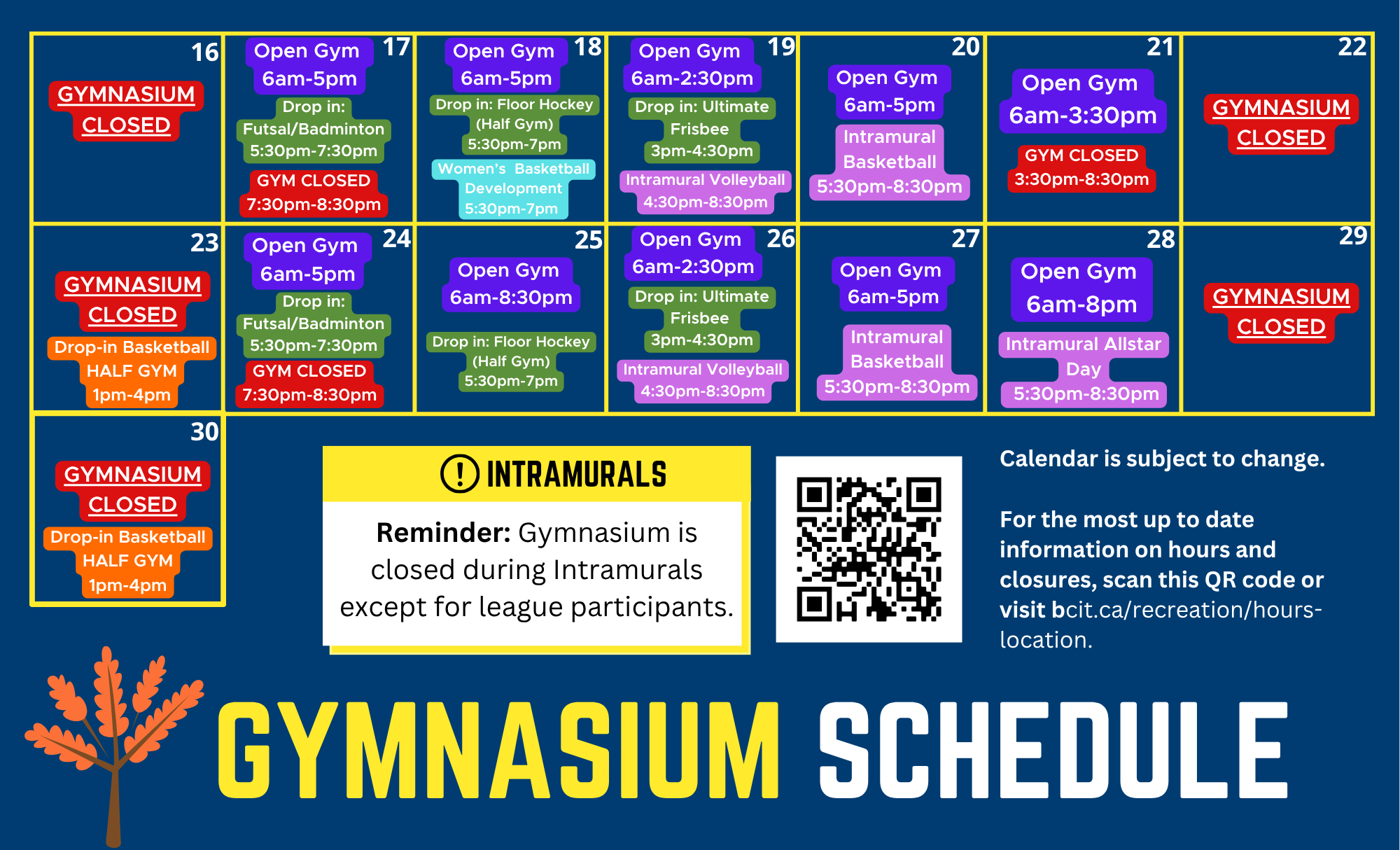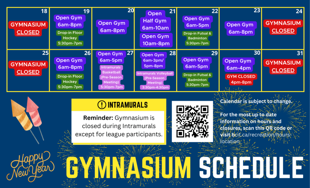 The Recreation building at SE16 on the Burnaby Campus will be closed on the following dates in 2025: